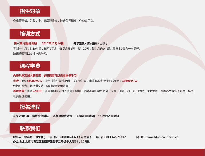 (模塊九) 中國(guó)文化根基 | 1.中國(guó)文化與強(qiáng)國(guó)之夢(mèng) 2.易經(jīng)與決策思想 3.儒家的基本精神:修身與治世 4.《金剛經(jīng)》與處事哲學(xué)智慧 5.道家的基本精神與《道德經(jīng)》精讀 6.《 黃帝內(nèi)經(jīng)》與養(yǎng)生智慧 | (模塊十) 增值課程 | 1.企業(yè)家導(dǎo)師實(shí)踐課+論壇 2.同學(xué)會(huì)&主題俱樂(lè)部 3.走進(jìn)企業(yè)參訪游學(xué) 4.走進(jìn)城市政府與市長(zhǎng)對(duì)話+班級(jí)年會(huì)+百城市長(zhǎng)公益論壇 |