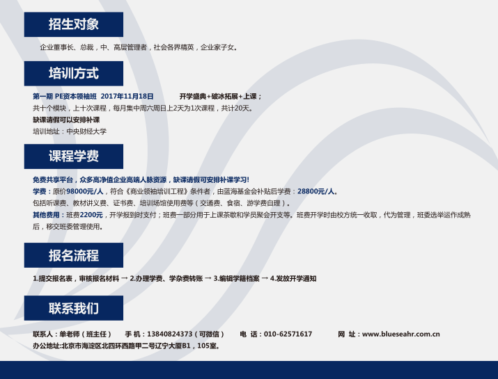(模塊九) 創(chuàng)業(yè)板上市融資 | 1.創(chuàng)業(yè)板上市條件與流程 2.財(cái)務(wù)審計(jì)/驗(yàn)資/盈利預(yù)測(cè) 3.上市籌劃與包裝 4.已上市企業(yè)的再融資 | (模塊十) 增值課程 | 1.企業(yè)家導(dǎo)師實(shí)踐課+論壇 2.同學(xué)會(huì)&主題俱樂部 3.走進(jìn)企業(yè)參訪游學(xué) 4.走進(jìn)城市政府與市長對(duì)話+班級(jí)年會(huì)+百城市長公益論壇 |