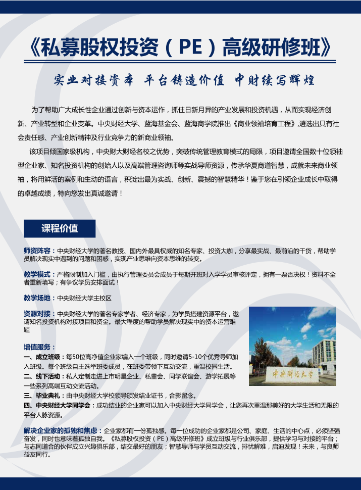(模塊五) 新興產(chǎn)業(yè)投資指引 與財(cái)富管理 | 1.互聯(lián)網(wǎng)+產(chǎn)業(yè)政策解讀 2.產(chǎn)業(yè)資源整合與資本運(yùn)作 3.互聯(lián)網(wǎng)、產(chǎn)業(yè)集群與全球生產(chǎn)網(wǎng)絡(luò) 4.資產(chǎn)證券化運(yùn)作與管理 5.家族基金與財(cái)富傳承 | (模塊六) 私募股權(quán)基金的項(xiàng)目選擇 與投融資操作 | 1.投資者與融資模式的選擇 2.標(biāo)的公司尋覓及實(shí)地盡職調(diào)查 3.企業(yè)價(jià)值的評(píng)估與定價(jià) 4.企業(yè)融資對(duì)資本結(jié)構(gòu)的影響 5.投資效益分析 6.股權(quán)融資形式 |