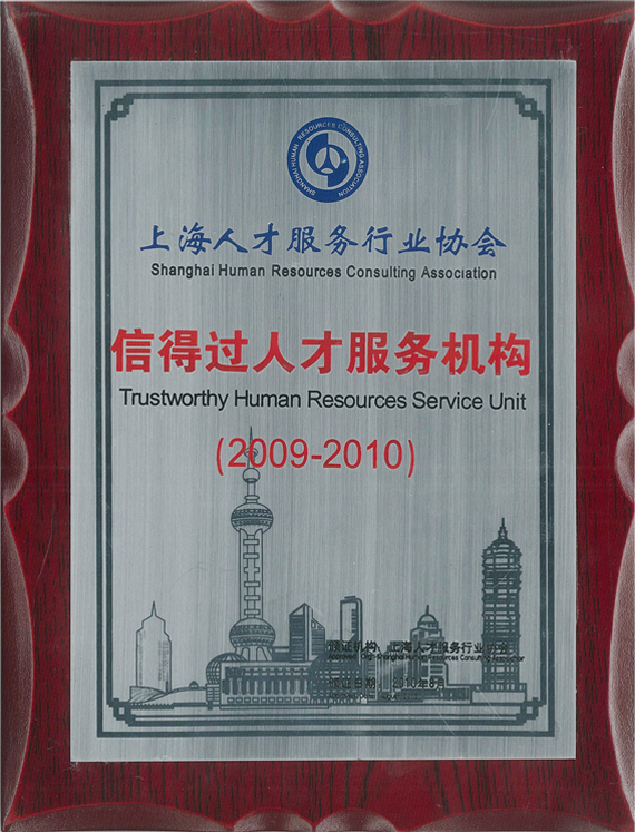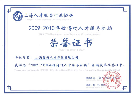由上海人才服務行業(yè)協(xié)會主辦的“2009-2010年上海市信得過人才服務機構”頒獎典禮昨天下午舉行。本次會議上共計89家人力資源服務機構榮獲“信得過人才服務機構”稱號。藍海集團憑借著多年來優(yōu)質的服務美譽度、良好的市場口碑以及廣泛的社會影響力獲此殊榮。