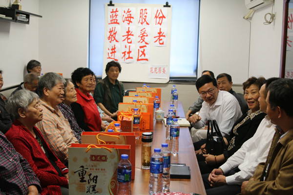 九九重陽(yáng)久久情,久久情意暖心懷!2015年10月16日,藍(lán)海股份黨支部組織黨員、工會(huì)干部為長(zhǎng)征鎮(zhèn)花苑小區(qū)的老人們帶去了“重陽(yáng)節(jié)”久久、淳淳的關(guān)懷和慰問(wèn)品。