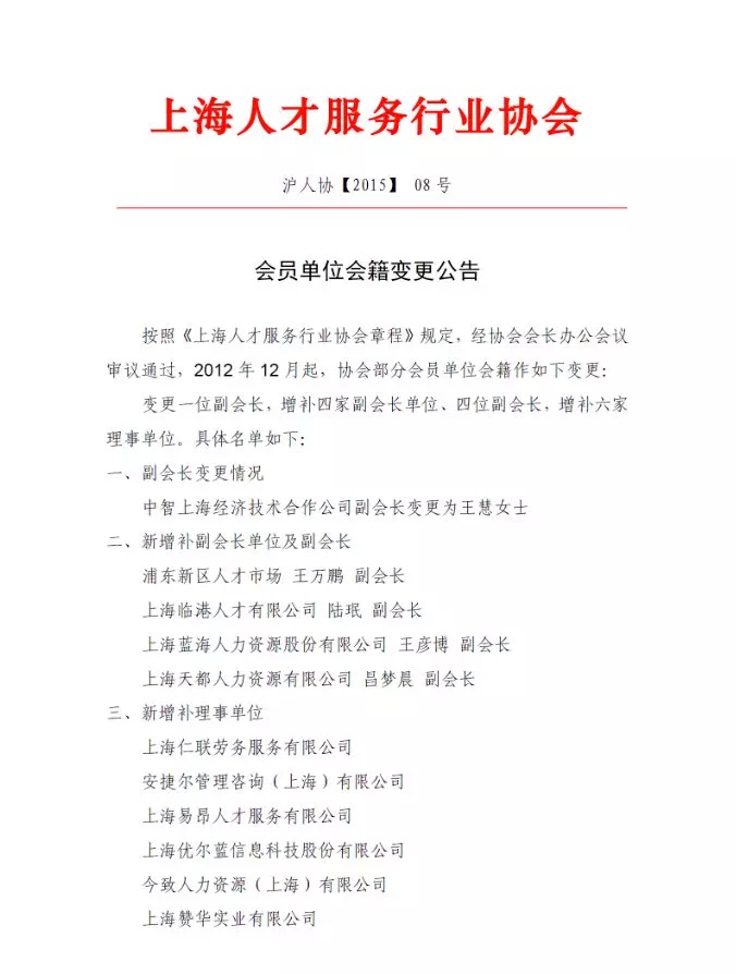按照《上海人才服務(wù)行業(yè)協(xié)會(huì)章程》規(guī)定,經(jīng)協(xié)會(huì)會(huì)長(zhǎng)辦公會(huì)議審議通過(guò),2012年12月起,協(xié)會(huì)部分會(huì)員單位會(huì)籍作如下變更:
