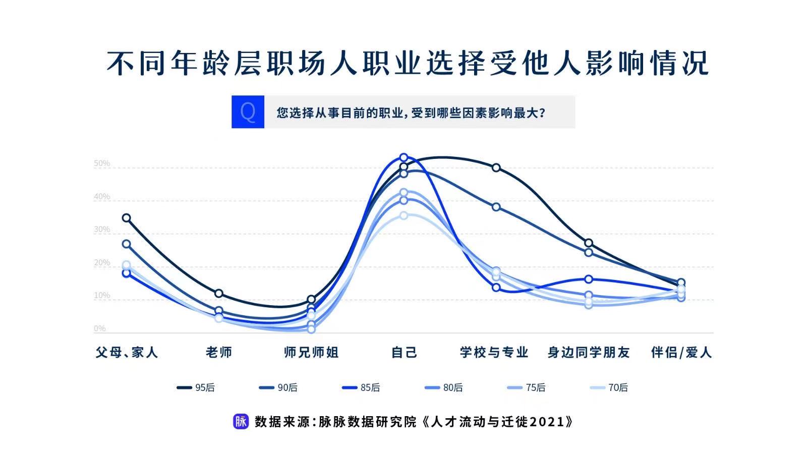 同時,若橫向?qū)Ρ雀改讣胰藢τ诼殬I(yè)選擇的影響,95后達(dá)到了35%,受到父母的影響最大。反而是70后與80后,職業(yè)選擇受父母的影響相對小一些。