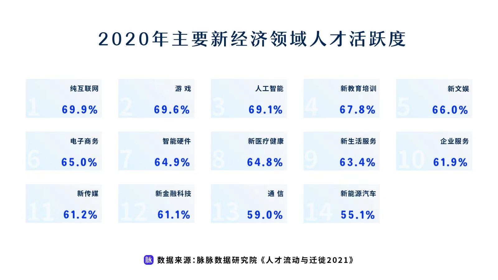 從新經(jīng)濟(jì)領(lǐng)域的人才活躍度來看,游戲、人工智能與新教育培訓(xùn)人才活躍度更高;相較而言,新金融科技、通信、新能源汽車等傳統(tǒng)行業(yè)影響更深的領(lǐng)域,人才活躍度更低。