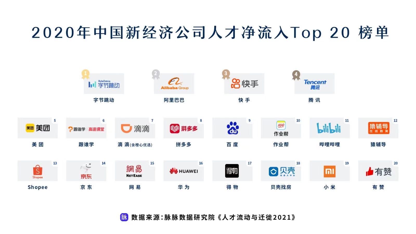 四處出擊的字節(jié)跳動人才吸引力強(qiáng)勁,成為2020年最多人才流入的新經(jīng)濟(jì)公司,阿里巴巴緊隨其后。而快手風(fēng)頭正勁,位列第三。相對而言,騰訊的風(fēng)頭略遜,位居第四。字節(jié)跳動持續(xù)擴(kuò)張,成為各類互聯(lián)網(wǎng)公司人才跳槽的首選去處,但同時也向各家頭部公司輸出人才。