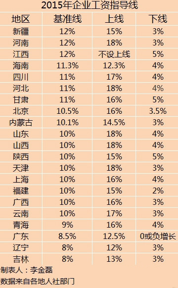 在這21個(gè)地區(qū)中,新疆、河南和江西的基準(zhǔn)線最高,為12%;在工資增長(zhǎng)上線方面,天津、山西、山東、河北、河南均為18%,并列第一;而工資增長(zhǎng)的下線,陜西、江西和甘肅最高,為5%。