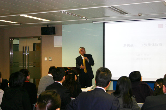 本次研討會(huì)的主題是工資集體協(xié)商。在我國,《勞動(dòng)法》、《工會(huì)法》、《勞動(dòng)合同法》已明確要建立工資集體協(xié)商機(jī)制。但是,在實(shí)際推進(jìn)過程中,非公企業(yè)、外資企業(yè)的工資集體協(xié)商機(jī)制如何建立,區(qū)域性、行業(yè)性工資集體協(xié)商機(jī)制的法律地位如何確認(rèn),工資集體協(xié)商的內(nèi)容、程序,政府有關(guān)部門的職責(zé)如何界定,工資談判員的勞動(dòng)權(quán)益如何保障,這些都是擺在公司人力資源部門面前的難題。針對這些問題,馬建軍律師從對與工資集體協(xié)商有關(guān)的三個(gè)案例分析開始,詳細(xì)而系統(tǒng)地講解了工資集體協(xié)商的由來以及企業(yè)該如何正確理解和進(jìn)行工資集體協(xié)商,并結(jié)合實(shí)際操作中遇到的各種問題,歸納出在進(jìn)行工資集體協(xié)商的過程中,企業(yè)應(yīng)該注意的各種問題,最后,馬律師向在座的嘉賓介紹了工資集體協(xié)商制度的發(fā)展趨勢。