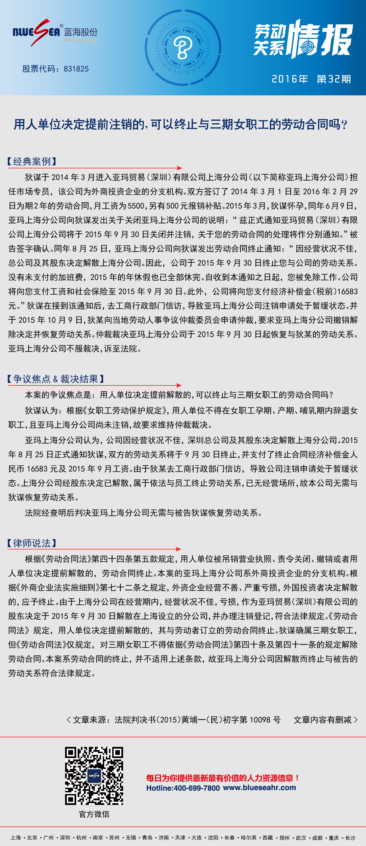 用人單位決定提前注銷的,可以終止與三期女職工的勞動合同嗎?