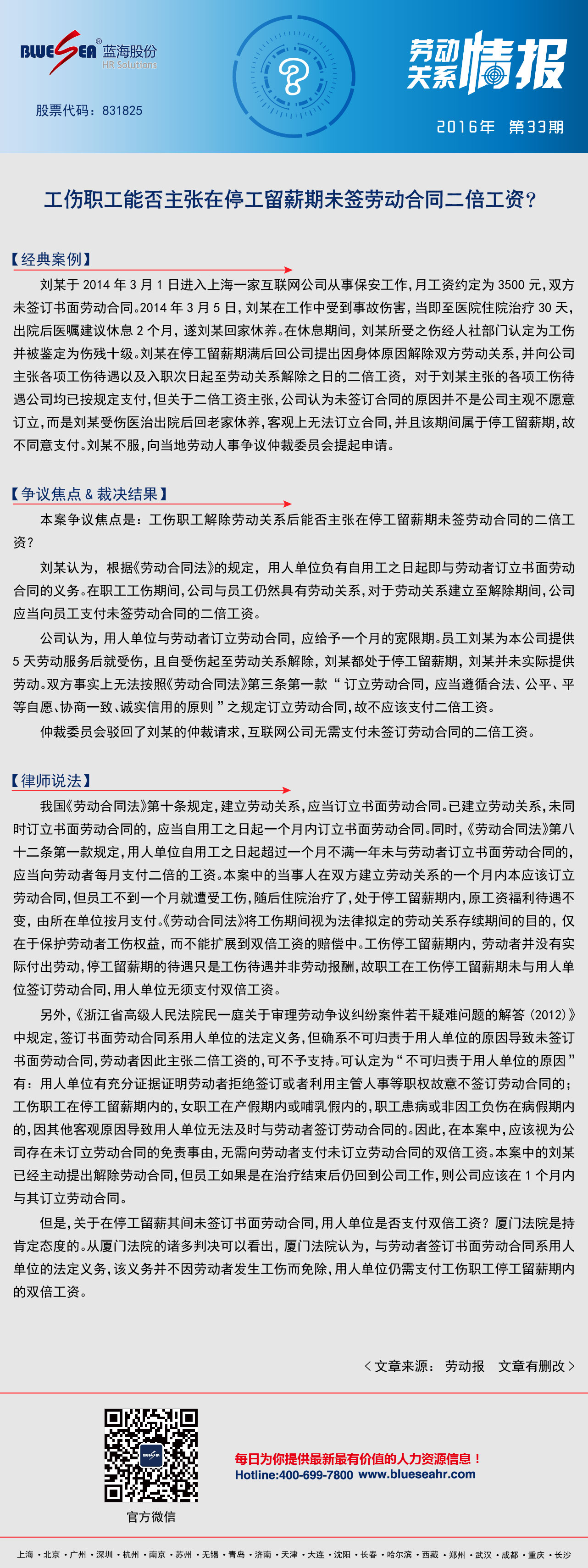 工傷職工能否主張在停工留薪期未簽勞動合同二倍工資?